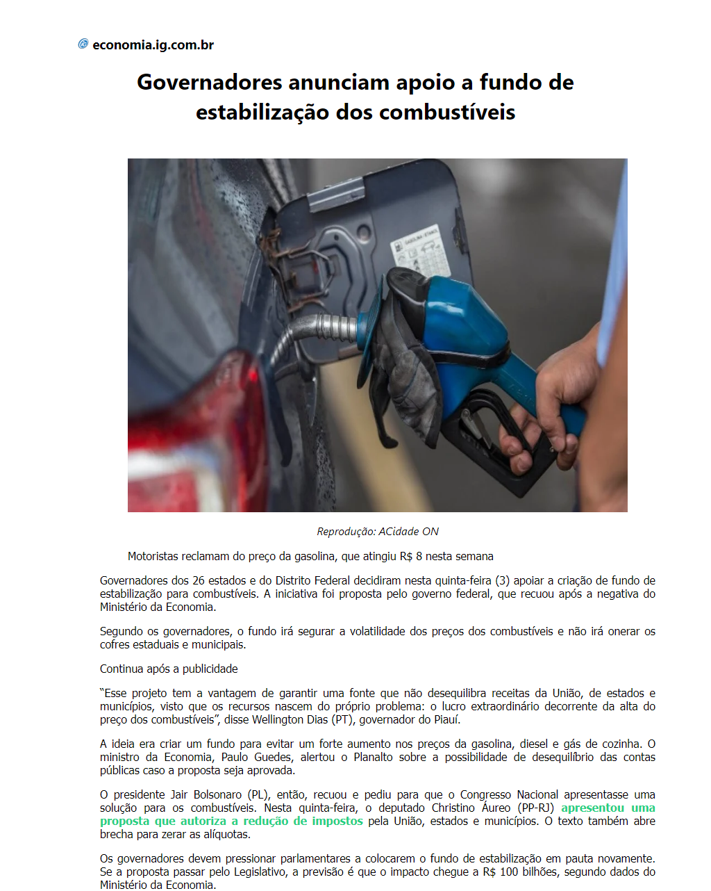 Governadores anunciam apoio a fundo de estabilização dos combustíveis