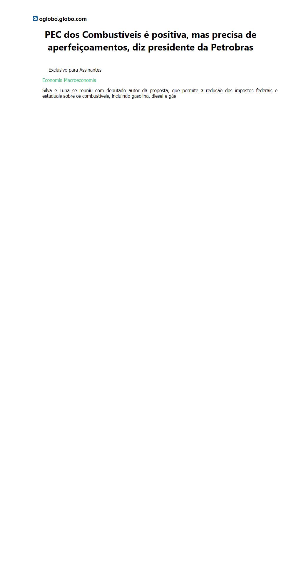 PEC dos Combustíveis é positiva, mas precisa de aperfeiçoamentos, diz presidente da Petrobras