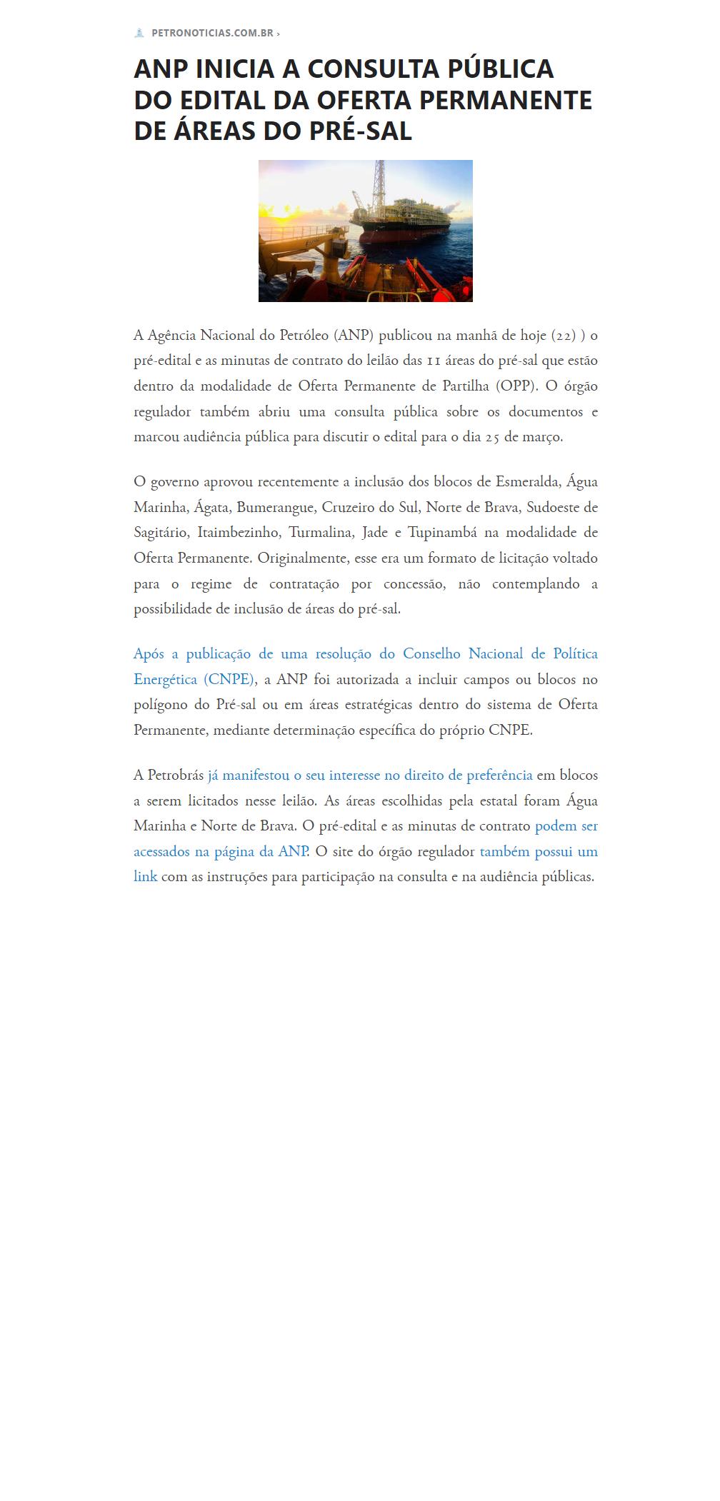 ANP INICIA A CONSULTA PÚBLICA DO EDITAL DA OFERTA PERMANENTE DE ÁREAS DO PRÉ-SAL