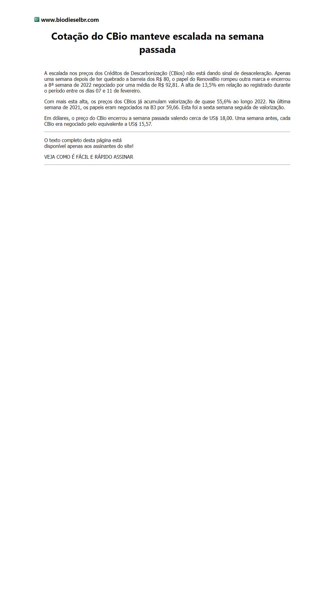 Cotação do CBio manteve escalada na semana passada