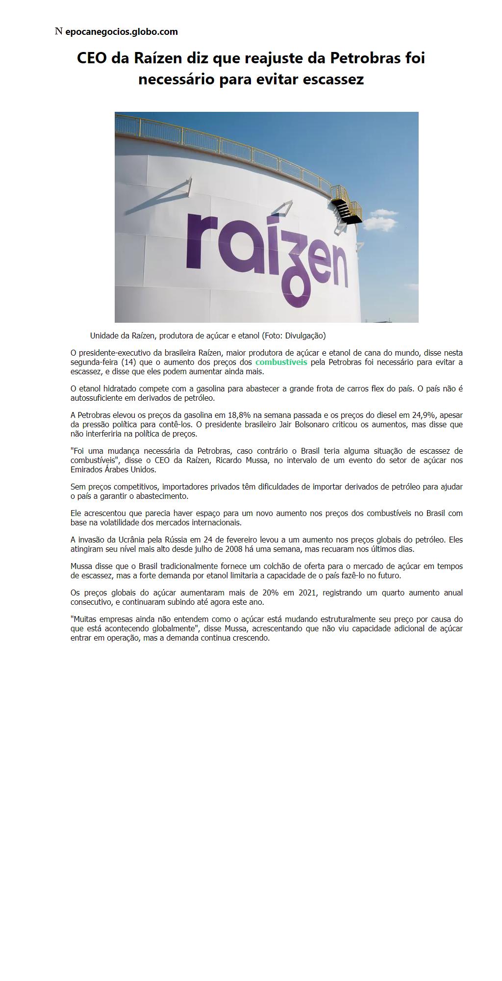 CEO da Raízen diz que reajuste da Petrobras foi necessário para evitar escassez