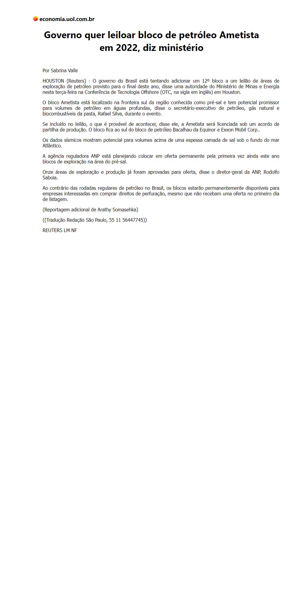 Governo quer leiloar bloco de petróleo Ametista em 2022, diz ministério
