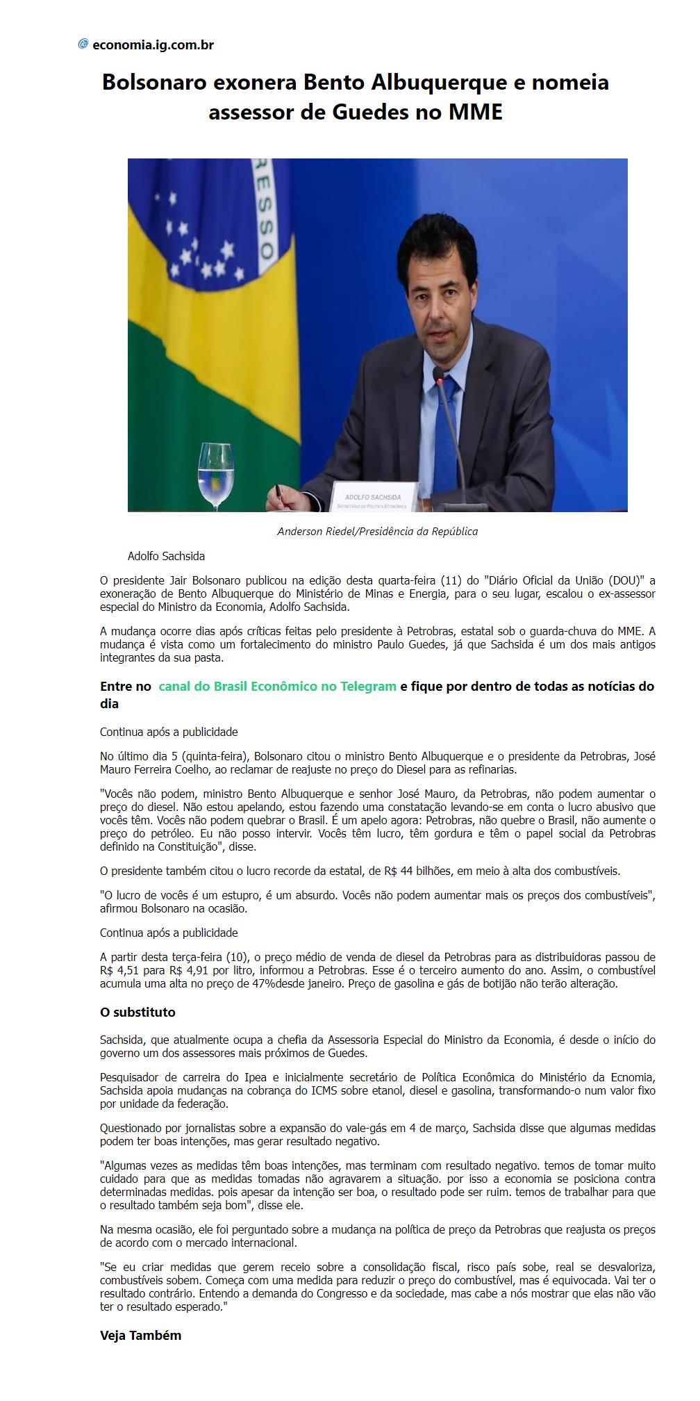 Bolsonaro exonera Bento Albuquerque e nomeia assessor de Guedes no MME