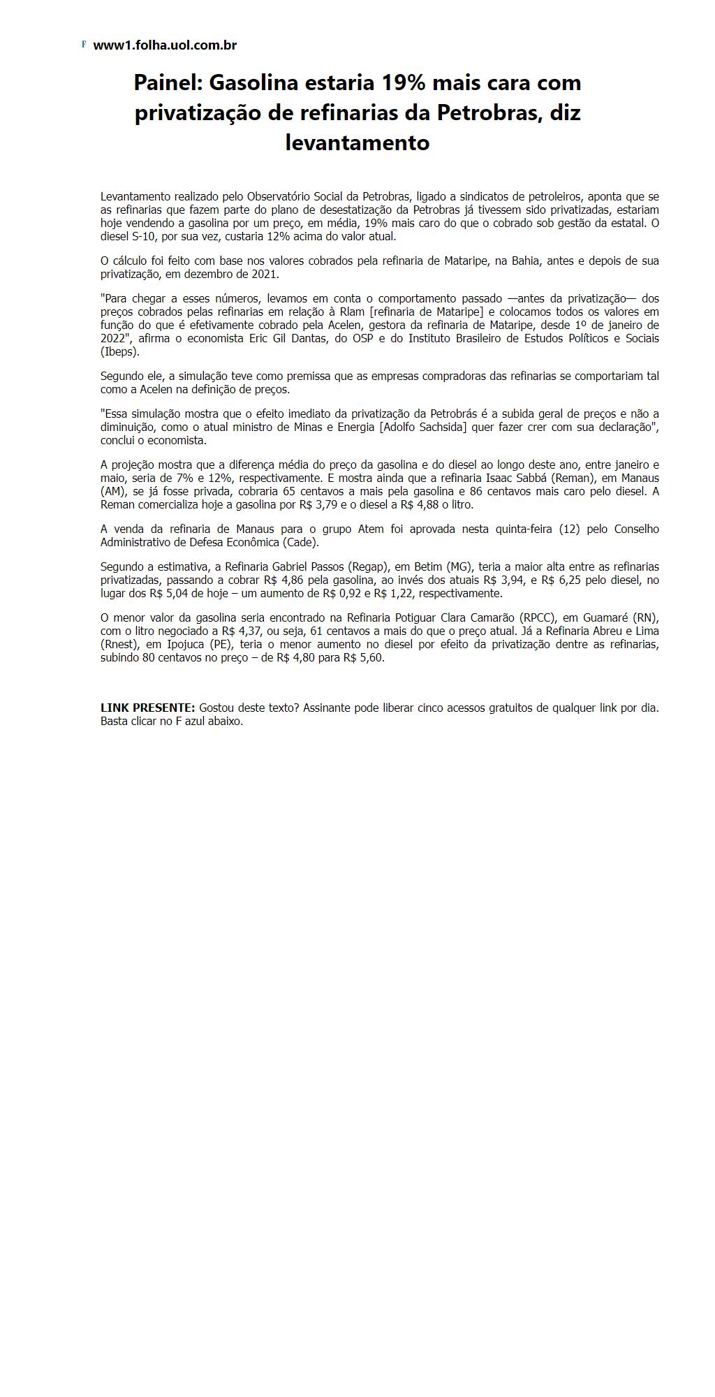 Gasolina estaria 19% mais cara com privatização de refinarias da Petrobras, diz levantamento