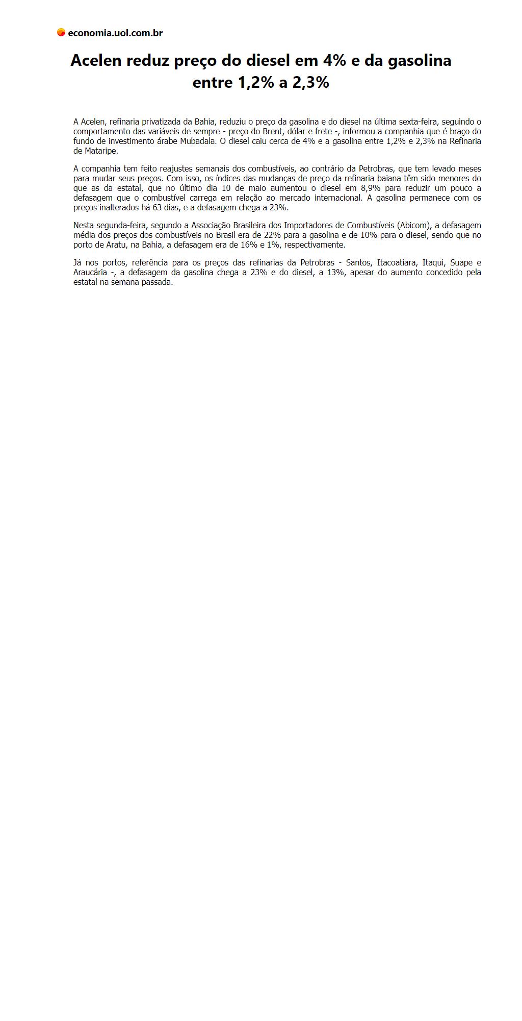 Acelen reduz preço do diesel em 4% e da gasolina entre 1,2% a 2,3%