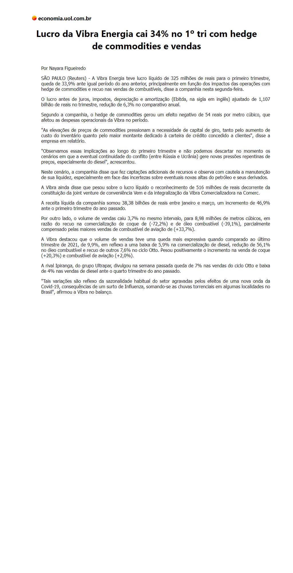 Lucro da Vibra Energia cai 34% no 1º tri com hedge de commodities e vendas