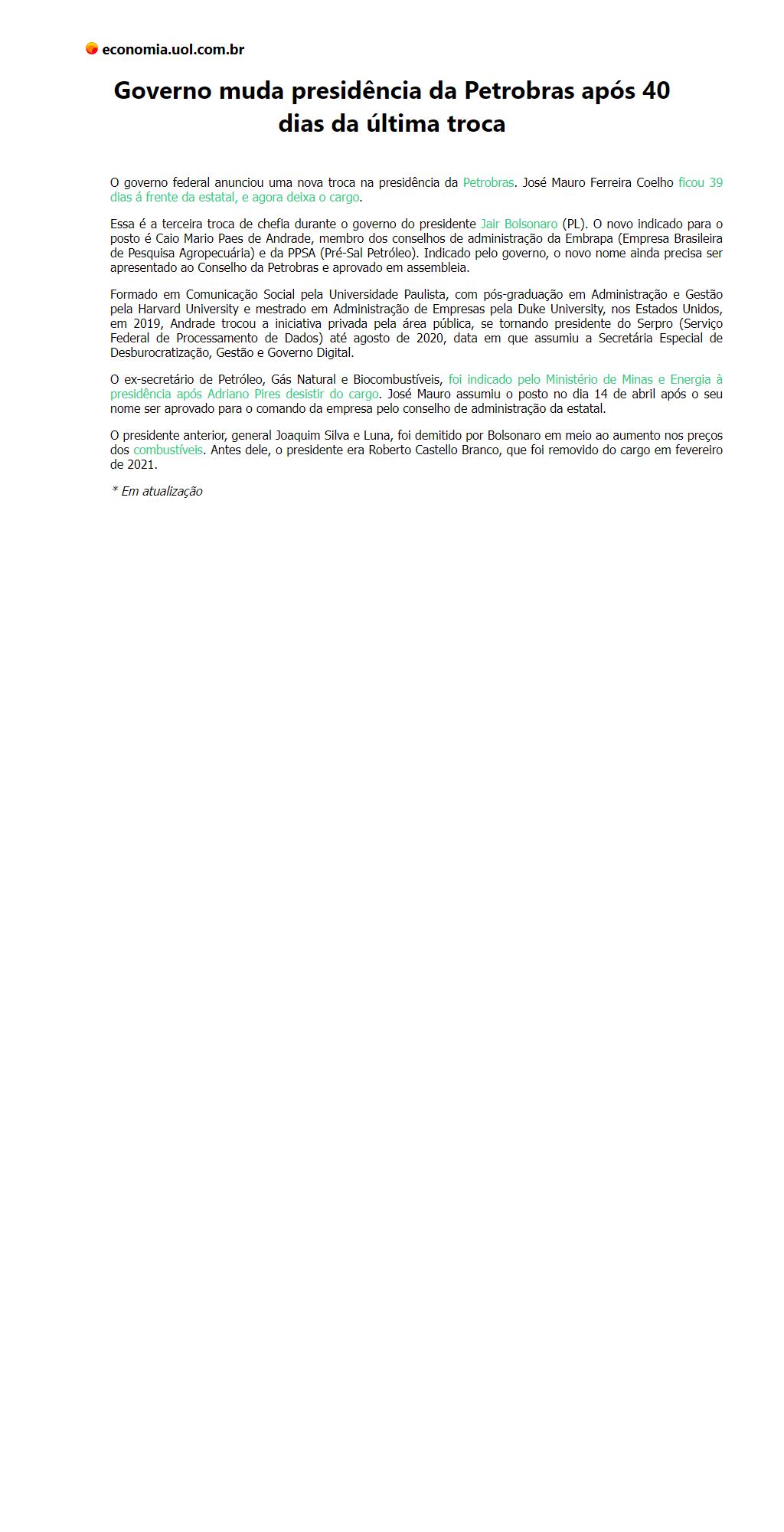 Governo muda presidência da Petrobras após 40 dias da última troca